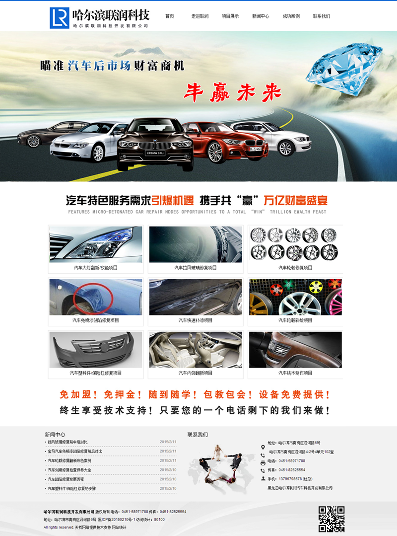 哈爾濱聯(lián)潤(rùn)科技開(kāi)發(fā)有限公司,是一家以:汽車大燈翻新/改色項(xiàng)目、汽車擋風(fēng)玻璃修復(fù)項(xiàng)目、汽車輪轂修復(fù)項(xiàng)目、汽車免噴漆凹陷修復(fù)項(xiàng)目、汽車快速補(bǔ)漆項(xiàng)目、汽車輪轂彩繪項(xiàng)目、汽車塑料件/保險(xiǎn)杠修復(fù)項(xiàng)目、汽車內(nèi)飾翻新項(xiàng)目、汽車桃木制作項(xiàng)目為主的高科技汽車科研開(kāi)發(fā)公司。